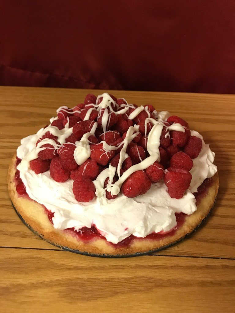 I baked another tart this week. The crust is called a Sable Breton- it’s more like a shortbread cookie than a regular tart. On top was peach raspberry jam, mascarpone cream, raspberries, and white chocolate. Yum!