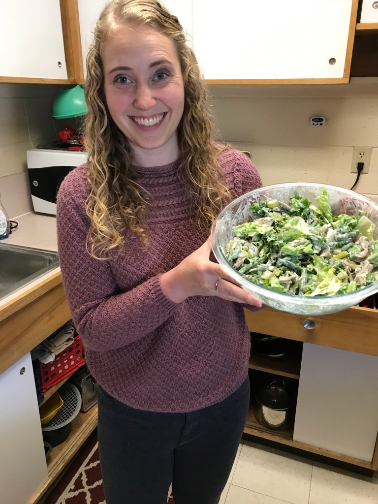 Wednesday morning, after a quick workout, I spent the whole morning baking and cooking. I made a caramel apple tart and a green bean salad. I just saw this salad recipe on The Kitchen on Saturday and was excited to try it! It’s inspired by green bean casserole, but it’s much healthier! Mark helped me get started and then went to donate plasma while I finished everything up.