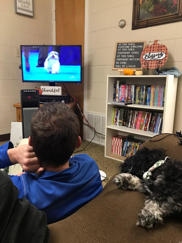 At home, Mark and I watched the National Dog Show. It’s one of my favorite parts of Thanksgiving. I just love seeing all the different breeds and learning what they were bred to do. Mark was so awesome to figure out how to get a free trial of YouTube TV so we could record it and watch it later. Here’s a picture of Flynn “cheering” for the Havanese.