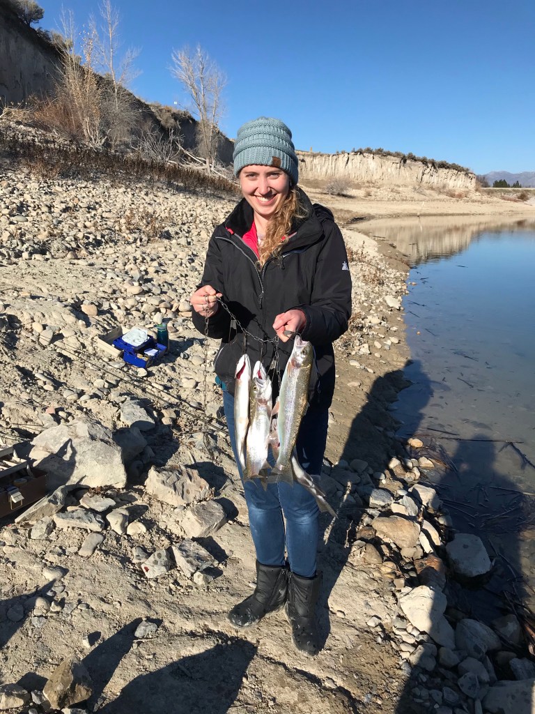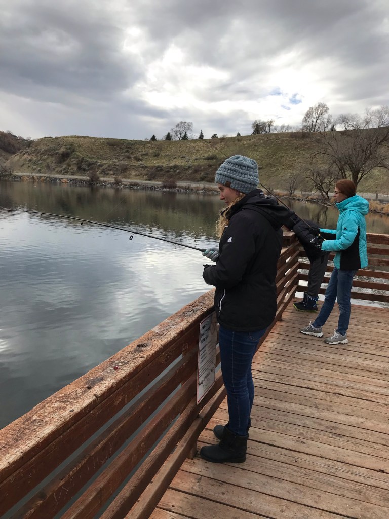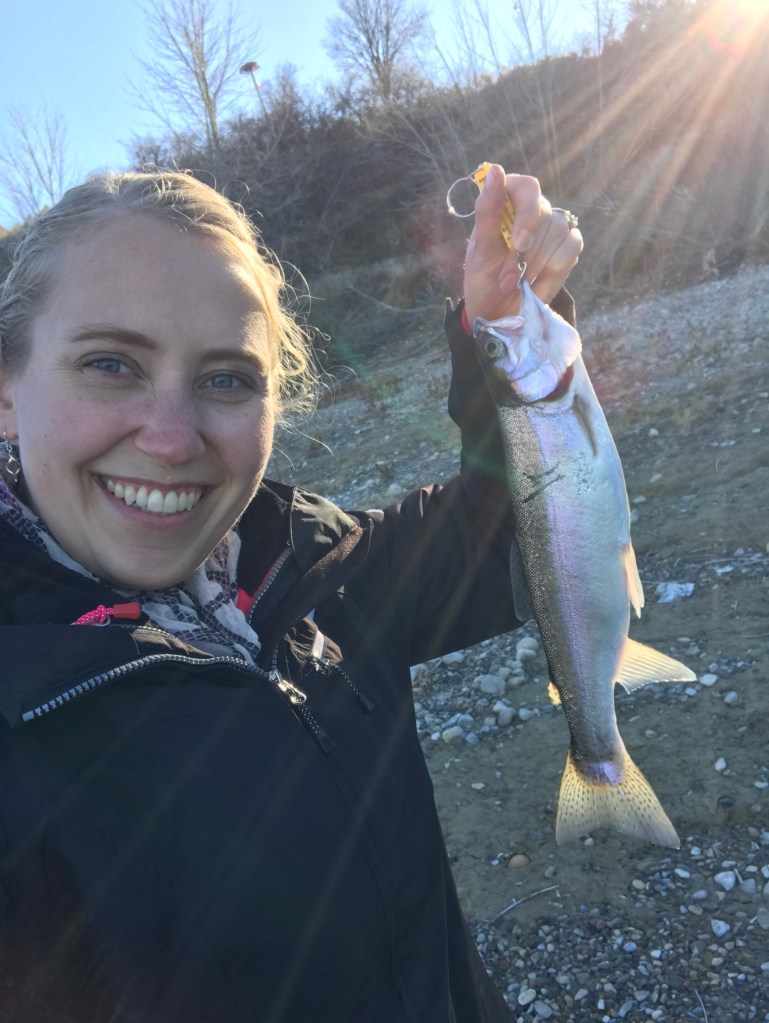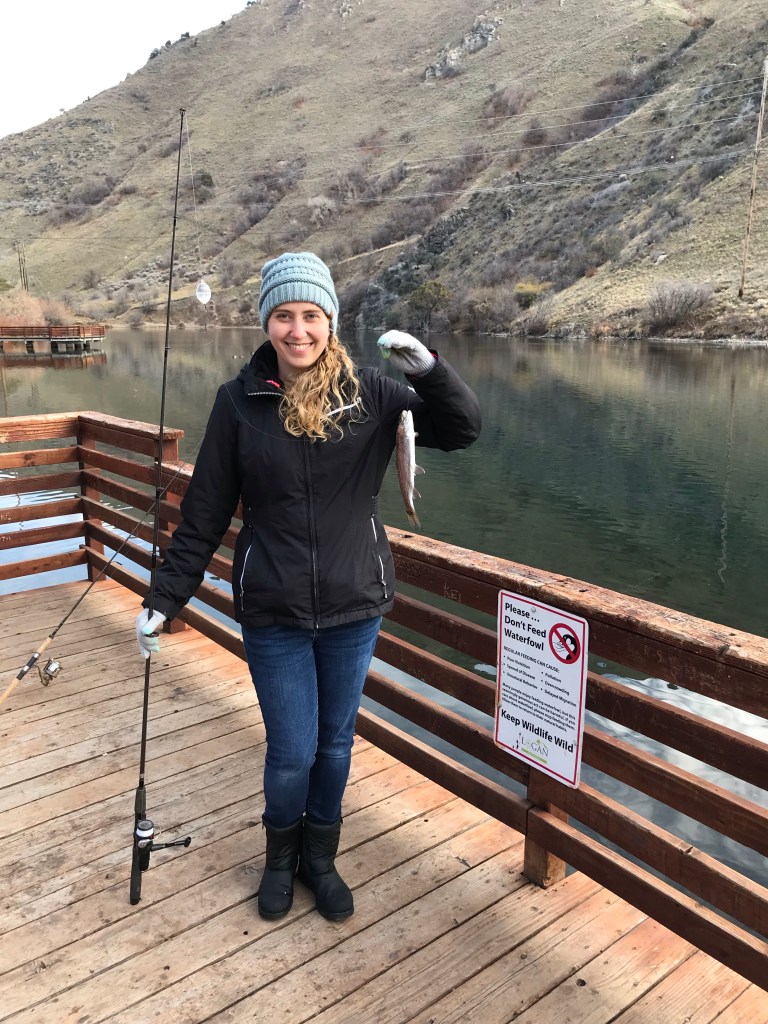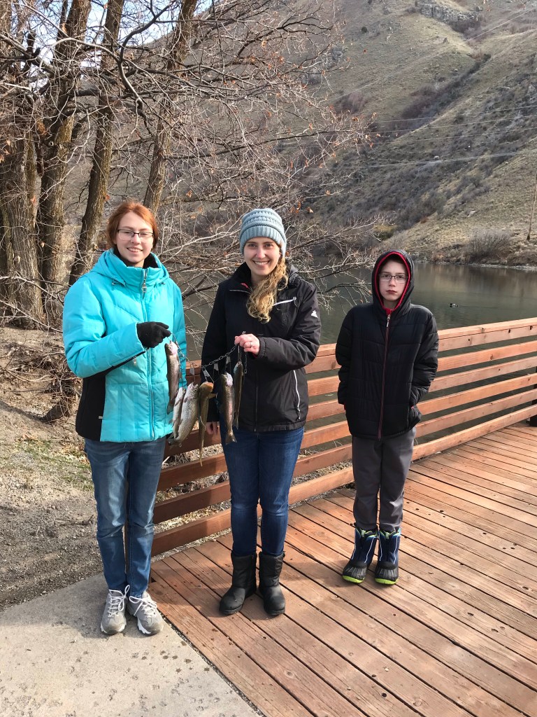 That afternoon, I went fishing at first dam with my dad and a niece and nephew. My Dad was so nice to buy me a fishing license for my Christmas present! Most of the fish we caught were small so we released some. We caught quite a few though! Mark and I cooked up a couple for dinner that night (using the new pans I got at Kohl’s that morning!)!