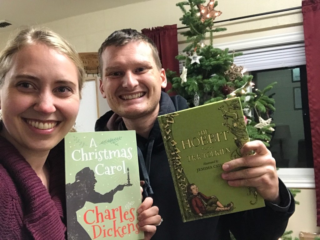 When we got home from the zoo, we did our Christmas Break Book tradition. Earlier, we had each picked a book to order from Amazon. On Friday, we wrapped and hid each other’s books. We were too tired to spend much time searching this year, so we gave each other hints to make it go faster haha! I think it would have taken a long time without hints! Mark hid mine in our flour bucket and I hid Mark’s behind our DVD’s. It really is wonderful sitting by the tree reading together after we find our books. So peaceful. One of my favorite Christmas feelings. I got A Christmas Carol! I wanted to read the original book after seeing the play and movie last week. It was really fun to see all the details the play and movie implemented from the book. I got a beautiful, silk-covered version with illustrations. I read the whole thing that night!! Mark requested The Hobbit! He listened to it on audible earlier this year and really wanted to own a copy. We found a nice, illustrated version for him too!!