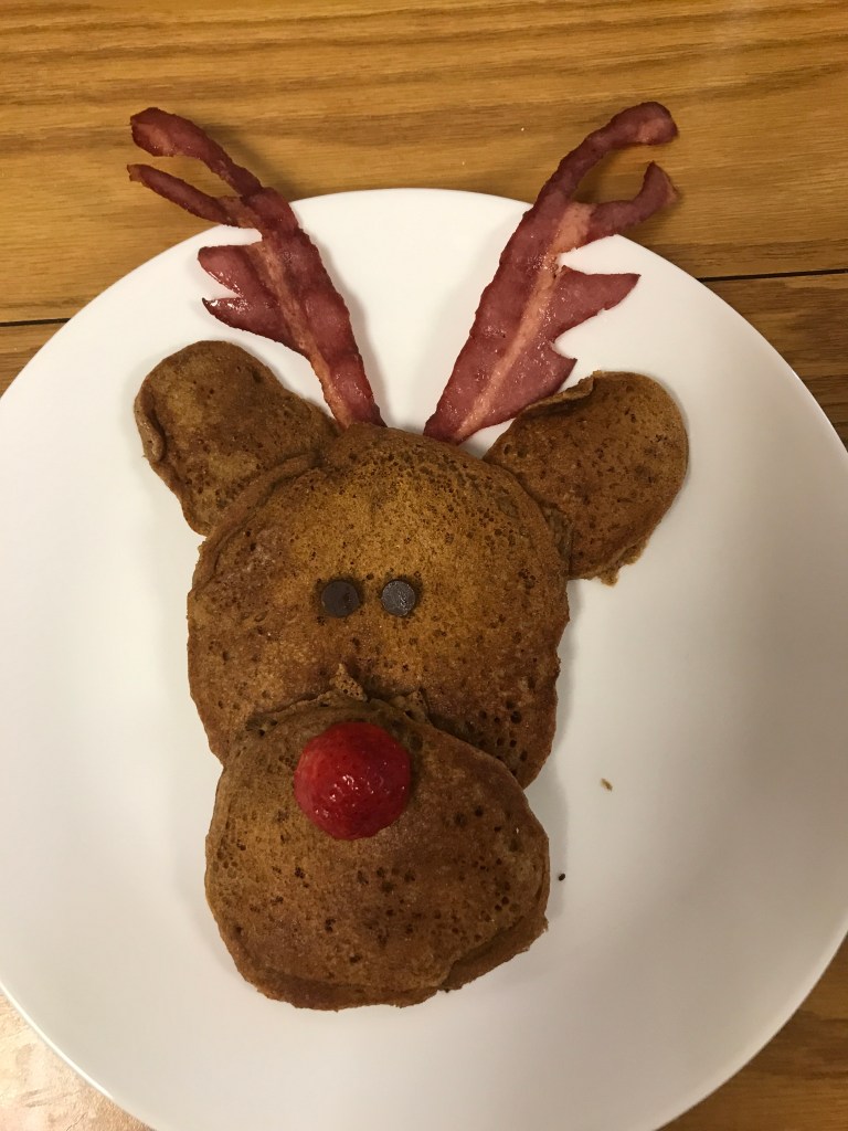 Saturday morning, (after a quick exercise session and putting away our bed) we made gingerbread reindeer pancakes. They were delicious and adorable! Mark cut the bacon to look like antlers and I baked the pancakes.