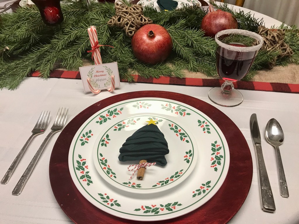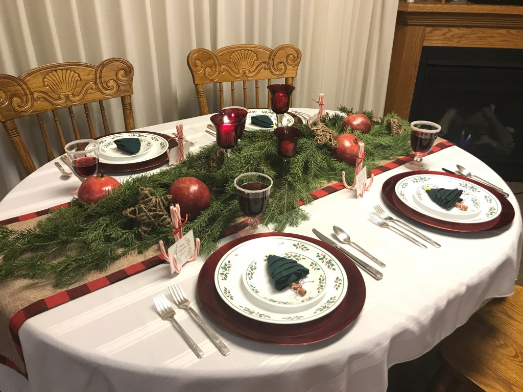 That evening, we had Christmas Eve Dinner with my parents. My mom cooked all the food, but I was in charge of setting the table. Thanks to Pinterest, it turned out really nice! We had a nice, quiet dinner with just the four of us and then read a little Christmas program before dessert.