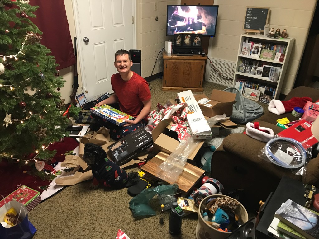 After breakfast, we headed to my parents’ to give them their Christmas gifts. My mom liked her African Violet and my Dad was really excited for his candy dispenser! I had another present to open at their house from Mark. It was really big and Mark thought I might see what it was if it was delivered to our house. I had no idea what it was, but I had been joking it was a miniature pony. I planned to name him Winston. 🙂 Turns out Winston is actually an exercise bike! We’re going to have to rearrange a few things to make space for it, but it’s going to be so nice to take a break from the exercise videos I do every day.