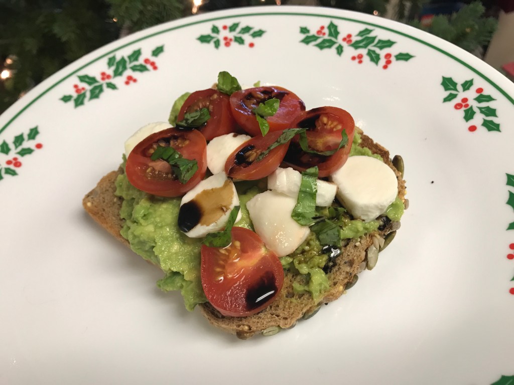 We made avocado caprese toast for breakfast. It was delicious and very festive!