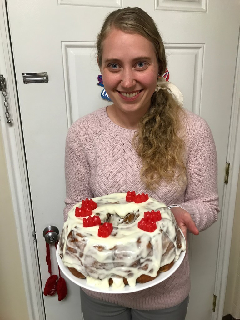 For our date on Friday, we had a “Chopped” challenge. I gave Mark two ingredients to use when making dinner and he gave me two ingredients to use in dessert. Mark used the assigned tofu and coconut milk to make a curry with rice noodles. It was amazing and I think we’ll make it again! I made monkey bread with my assigned cinnamon bears and cream cheese. As I was making it, Make suggested I put a piece of cinnamon bear inside the balls of dough. That turned out to be a delicious idea!