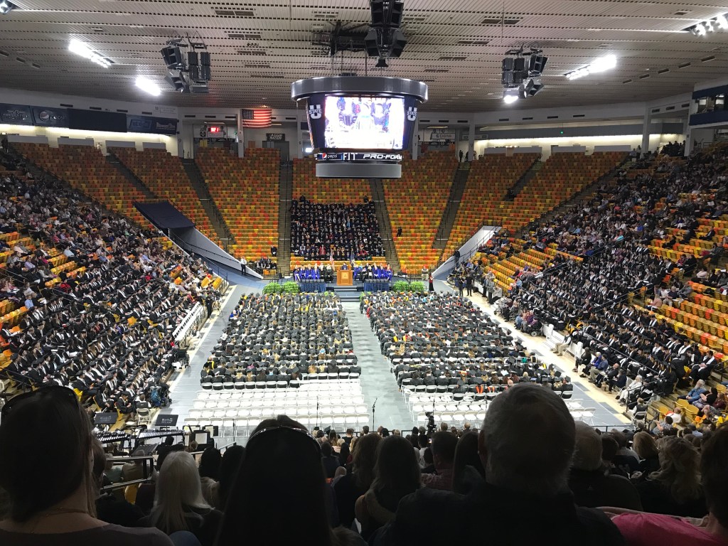 Mark liked the USU tie I got him as a graduation present, and on Thursday I finished teaching earlier than usual so I could make him breakfast.  Mark met on the quad Thursday morning for the parade of graduates.  The students at the elementary school on campus came out to cheer and Mark saw one boy from the primary class he taught last year.  The commencement speaker was Eric Hipple. He spoke on mental health and resources and techniques that helped him.  (Mark is sitting near the back, right corner, on the floor.)