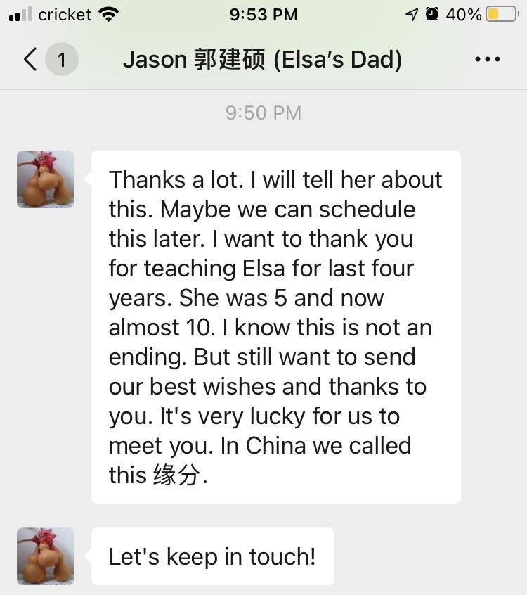 I only had one VIPKID class this week and it was my very last one! I’m definitely going to miss my students, but I’m not as sad as I thought I might be to be done. I’m looking forward to more sleep and more time! A lot of my students and their parents sent me sweet messages on WeChat thanking me for teaching them. I’m happy we can maintain our friendships online!
