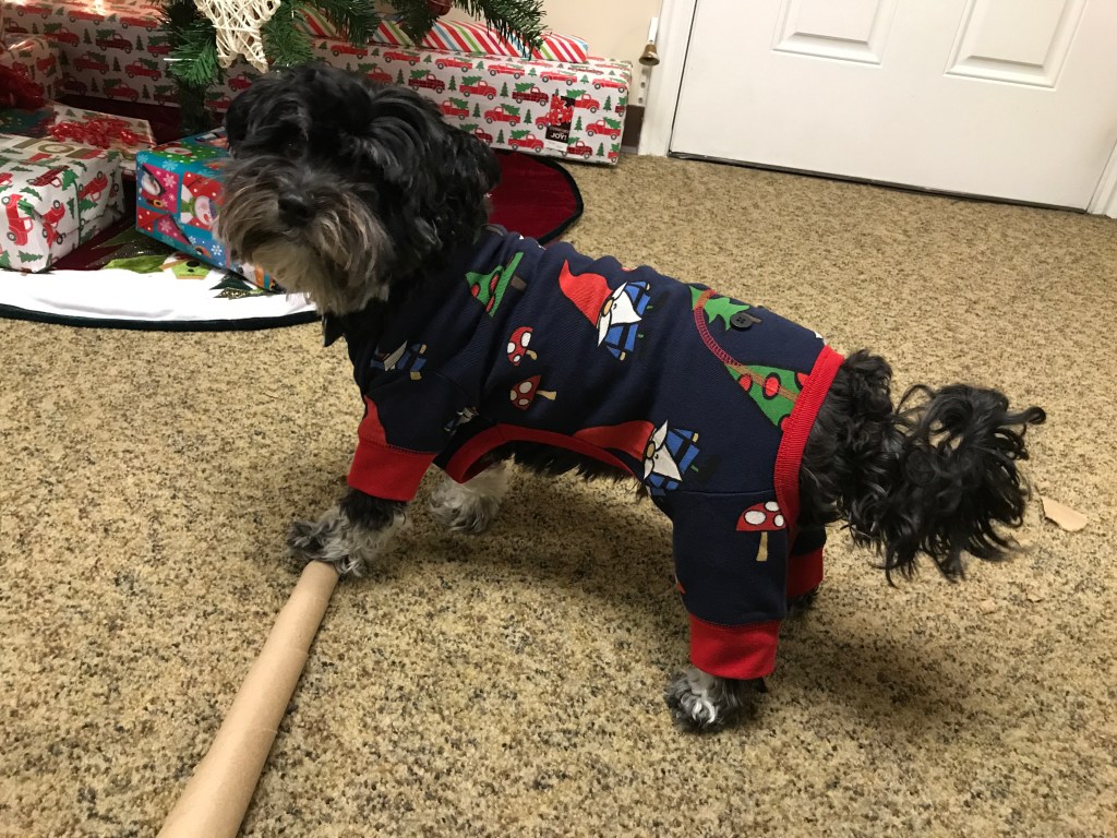 Flynn got some toys (which needed repair after about five minutes) and a new collar and harness. He was SO happy on Christmas. He was really good at ripping the paper off our presents.