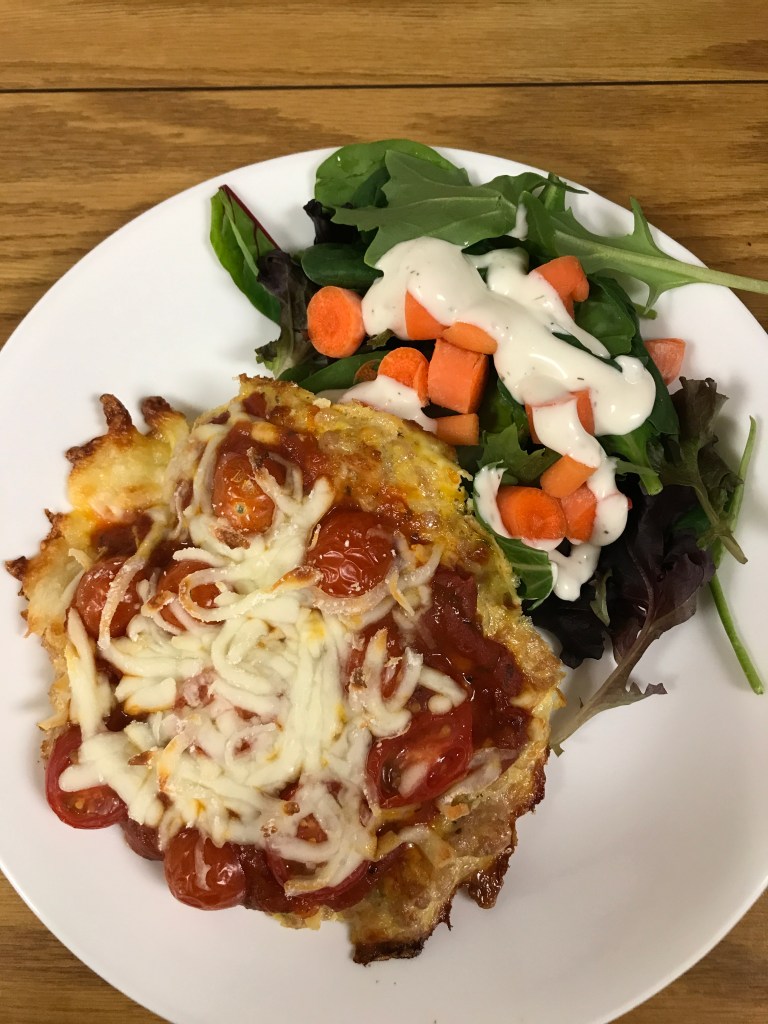 We’ve been applying lessons from our health coach and have been focusing on making low carb, high protein meals this week. Our favorite was pizza crust made from ground chicken.